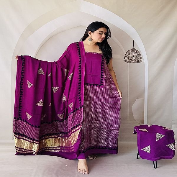 Home › Products › Unstitched Dress Material › Hand Block Print Modal Silk Ajrakh Pink Dress Material