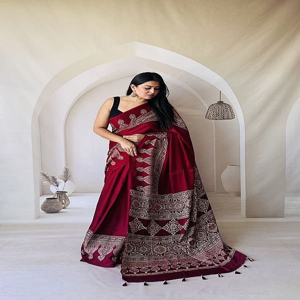 Home › Products › Modal Silk Printed Saree › Maroon Hand Block Printed Modal Silk Ajrakh Saree