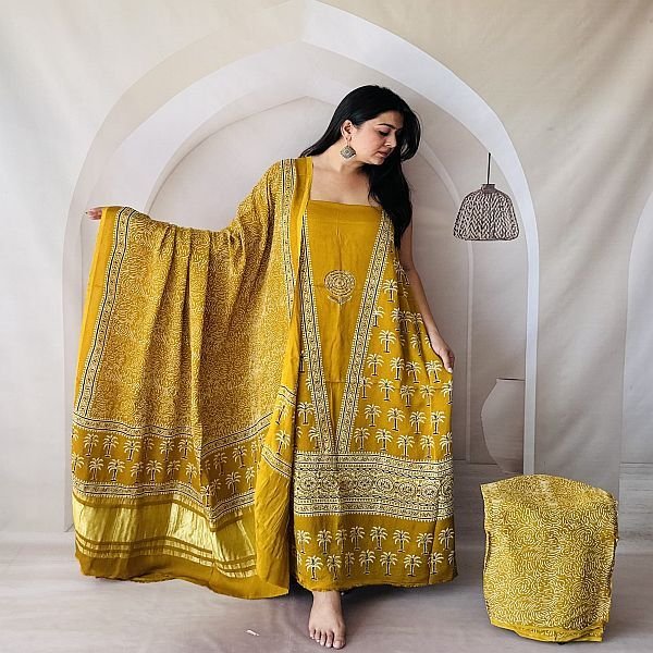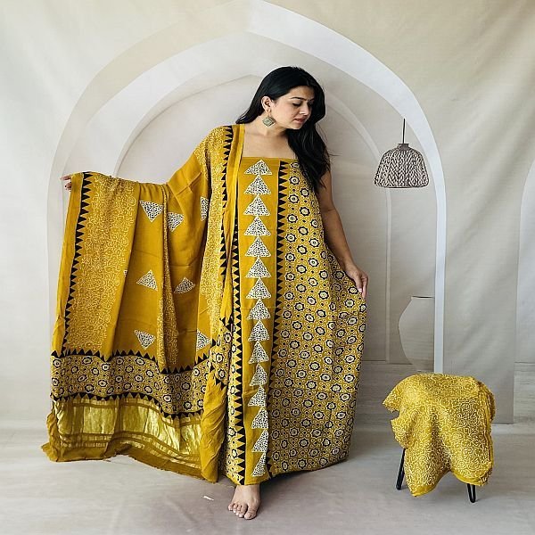 Home › Products › Unstitched Dress Material › Mustard Ajrakh Hand Block Printed Modal Silk Dress Material